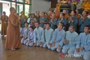 Seorang Biksu dari Fo Guang Shan menyampaikan khutbah di hadapan umat Buddha saat mengunjungi Vihara Bodhi Dharma Loka Kendal, Kaloran, Temanggung, Jawa Tengah, Kamis (13/3/2025). Sejumlah Biksu dari Fo Guang Shan yang merupakan satu-satunya organisasi Buddha besar di Taiwan mengunjungi berbagai tempat di wilayah Temanggung untuk melihat secara langsung kehidupan toleransi antarumat beragama dan mentransformasi ilmu tentang pengembangan UMKM bagi masyarakat pedesaan. ANTARA FOTO/Anis Efizudin/tom.