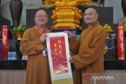 Pemimpin Tertinggi Fo Guang Shan, Most Venerable Hsin Bau (kiri) menyerahkan cendera mata kaligrafi motivasi kehidupan kepada Ketua Umum Majelis Agama Buddha Mahayana Indonesia (Mahabudhi) Bhiksu Samantha Kusala Mahasthavira (kanan) saat mengunjungi Vihara Bodhi Dharma Loka Kendal, Kaloran, Temanggung, Jawa Tengah, Kamis (13/3/2025). Sejumlah Biksu dari Fo Guang Shan yang merupakan satu-satunya organisasi Buddha besar di Taiwan mengunjungi berbagai tempat di wilayah Temanggung untuk melihat secara langsung kehidupan toleransi antarumat beragama dan mentransformasi ilmu tentang pengembangan UMKM bagi masyarakat pedesaan. ANTARA FOTO/Anis Efizudin/tom.