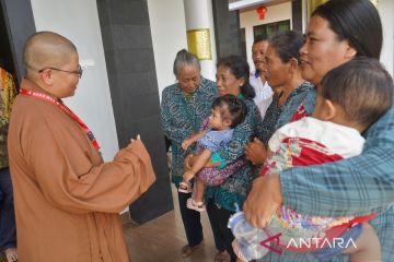Seorang Biksu dari Fo Guang Shan berdialog dengan umat Buddha saat mengunjungi Vihara Bodhi Dharma Loka Kendal, Kaloran, Temanggung, Jawa Tengah, Kamis (13/3/2025). Sejumlah Biksu dari Fo Guang Shan yang merupakan satu-satunya organisasi Buddha besar di Taiwan mengunjungi berbagai tempat di wilayah Temanggung untuk melihat secara langsung kehidupan toleransi antarumat beragama dan mentransformasi ilmu tentang pengembangan UMKM bagi masyarakat pedesaan. ANTARA FOTO/Anis Efizudin/tom.