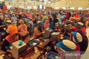 Pekerja memproduksi rokok Siagret Kretek Tangan (SKT) di pabrik rokok PT Djarum, Kudus, Jawa Tengah, Rabu (19/3/2025). Perusahaan tersebut membagikan uang THR kepada 50.552 karyawan melalui transfer ke rekening bank masing-masing karyawan yang tersebar di delapan kota dengan total Rp130.515.784.8500 guna membantu mereka dalam memenuhi kebutuhan keluarga selama bulan Ramadhan dan Idul Fitri. ANTARA FOTO/Yusuf Nugroho/tom.