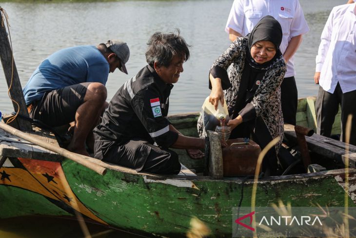Petugas BRIN dan pekerja memasukkan bahan bakar minyak (BBM) petasol hasil olahan limbah sampah plastik ke dalam tangki perahu nelayan di Rumah Pompa Kalibanger, Semarang, Jawa Tengah, Senin (5/5/2025). Inovasi pengolah sampah plastik menjadi BBM petasol (plastik PE setara solar) dengan proses penyulingan menggunakan mesin Fast Pyrolysis 5.0 yang diinisiasi Organisasi Riset Energi dan Manufaktur (OREM) Badan Riset dan Inovasi Nasional (BRIN) bersama Pemkot Semarang serta kelompok bank sampah Kemijen Bahagia itu sebagai upaya menangani dan mengelola sampah sehingga bermanfaat untuk perekonomian masyarakat sekaligus mengurangi volume pembuangan sampah rumah tangga di tempat pembuangan sampah akhir (TPSA). ANTARA FOTO/Makna Zaezar/tom.