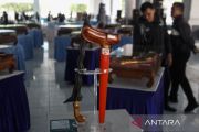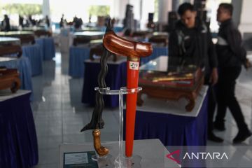 Pengunjung mengamati keris-keris pusaka yang dijual saat Jambore Nusantara Keris di Solo, Jawa Tengah, Selasa (24/6/2025). Kegiatan yang diikuti 125 penggemar pusaka keris dan senjata tradisioal dari seluruh Indonesia itu digelar untuk melestarikan pusaka yang telah ditetapkan UNESCO sebagai Intangible Cultural Heritage atau karya agung budaya dunia sekaligus sebagai ajang silaturahim dan edukasi mengenai beragam keris Indonesia. ANTARA FOTO/Maulana Surya/tom.