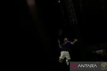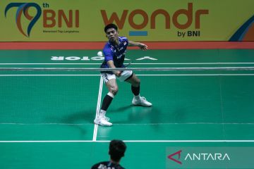 Pebulu tangkis tunggal putra Indonesia Moh Zaki Ubaidillah mengembalikan kok ke pebulu tangkis China Xiao Gai Bo pada perempat final tunggal putra Kejuaraan Wondr Badminton Asia Junior 2025 di GOR Manahan, Solo, Jawa Tengah, Jumat (25/7/2025). Moh. Zaki Ubaidillah mengalahkan Xiao Gai Bo dengan skor 2-1 (18-21, 21-11, 21-10). ANTARA FOTO/Maulana Surya/tom.