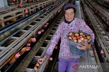 Pekerja mengumpulkan telur di peternakan ayam petelur Desa Muntung, Candiroto, Temanggung, Jawa Tengah, Senin (22/9/2025). Menurut Dinas Ketahanan Pangan, Pertanian dan Perikanan (DKPPP) Temanggung, di wilayah itu terdapat sekitar 1,2 juta ekor ayam petelur yang mampu memproduksi 70 ton telur per hari sehingga mengalami surplus hingga 20 ton per hari. ANTARA FOTO/Anis Efizudin/tom.