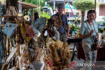 Pengunjung melihat produk kerajinan seni yang dijual pada pasar seni Solo Art Market (SAM) di Keprabon, Solo, Jawa Tengah, Minggu (26/10/2025). Pengelola pasar seni setempat rutin mempromosikan produk dari pelaku UMKM lokal untuk penguatan ekosistem kriya dan fesyen serta guna mendorong kunjungan wisata di Kota Solo. ANTARA FOTO/Maulana Surya/tom.