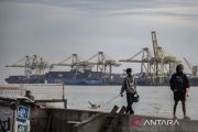 Warga berjalan di tanggul dengan latar belakang aktivitas bongkar muat peti kemas di Pelabuhan Tanjung Emas, Semarang, Jawa Tengah, Jumat (7/11/2025). Menteri Koordinator Bidang Infrastruktur dan Pembangunan Kewilayahan Agus Harimurti Yudhoyono (AHY) menargetkan kontribusi sektor maritim terhadap Produk Domestik Bruto (PDB) nasional dari 8,1 persen pada 2025 menjadi 9,1 persen pada 2029 melalui peningkatan kapasitas dan efisiensi pelabuhan utama serta penguatan jaringan tol laut yang menjadi tulang punggung logistik nasional. ANTARA FOTO/Aprillio Akbar/tom.