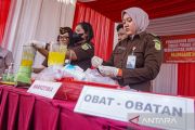 Petugas bersiap memasukkan obat terlarang ke dalam blender saat pemusnahan barang bukti di Kejaksaan Negeri Kabupaten Batang, Jawa Tengah, Kamis (11/12/2025). Kejaksaan Negeri Batang memusnahkan berbagai barang bukti perkara tindak pidana umum dan khusus yang telah berkekuatan hukum tetap periode 2024-2025 terdiri dari 12 senjata tajam, 7.984 butir obat terlarang, 1.081,164 gram sabu-sabu dan ganja serta barang bukti lainnya. ANTARA FOTO/Harviyan Perdana Putra/tom.