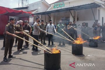 Bupati Batang M. Faiz Kurniawan (keenam kiri) didampingi Kepala Kejaksaan Negeri Batang Raymond Ali (keempat kanan) bersama pejabat lainnya membakar barang bukti tindak kejahatan di Kejaksaan Negeri Kabupaten Batang, Jawa Tengah, Kamis (11/12/2025). Kejaksaan Negeri Batang memusnahkan berbagai barang bukti perkara tindak pidana umum dan khusus yang telah berkekuatan hukum tetap periode 2024-2025 terdiri dari 12 senjata tajam, 7.984 butir obat terlarang, 1.081,164 gram sabu-sabu dan ganja serta barang bukti lainnya. ANTARA FOTO/Harviyan Perdana Putra/tom.