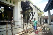 Personel polisi memeriksa kondisi rumah yang rusak pascalongsor di Desa Kajen, Kabupaten Tegal, Jawa Tengah, Rabu (11/2/2026). Curah hujan yang tinggi disertai angin kencang pada Selasa (11/2) mengakibatkan 21 rumah ambruk terdampak longsor dan 33 rumah terancam rusak. ANTARA FOTO/Oky Lukmansyah/tom.