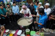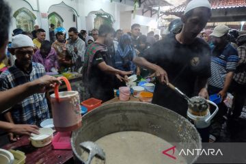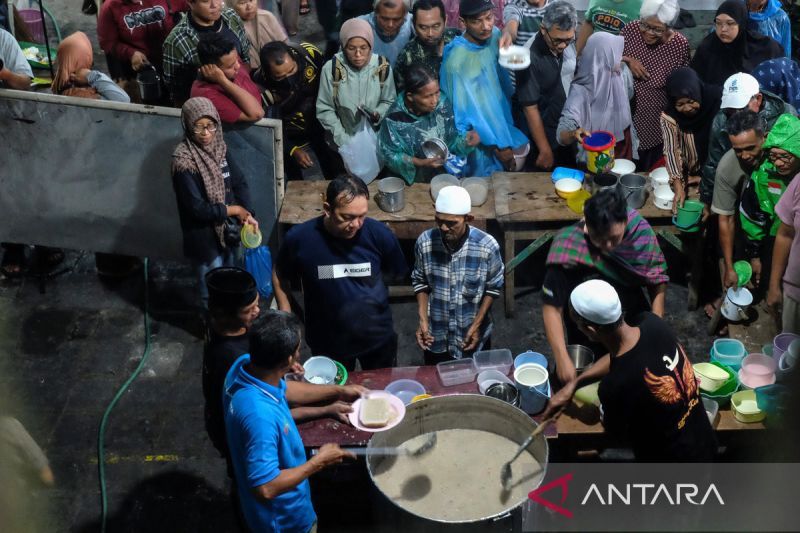 Petugas membagikan takjil bubur samin Banjar kepada warga yang mengantre di halaman Masjid Darussalam Solo, Jawa Tengah, Kamis (19/2/2026). Pengurus masjid setempat menyediakan sekitar 1.000 porsi bubur samin per harinya untuk dibagikan secara gratis kepada warga tiap jelang berbuka puasa sebagai upaya melestarikan tradisi komunitas warga keturunan Banjarmasin yang telah ditetapkan sebagai warisan budaya tak benda. ANTARA FOTO/Maulana Surya/tom.