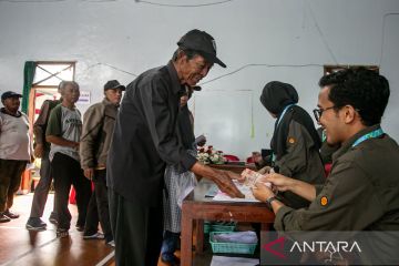 Petugas menyerahkan uang kepada warga saat pembagian tunjangan hari raya (THR) dari Bumdes di Desa Berjo, Ngargoyoso, Karanganyar, Jawa Tengah, Selasa (3/3/2026). Pemerintah Desa (Pemdes) setempat memberikan THR senilai Rp500 ribu kepada 1.446 kepala keluarga yang bersumber dari pendapatan asli desa, salah satunya Bumdes dalam mengelola potensi wisata dan aset desa. ANTARA FOTO/Mohammad Ayudha/tom.